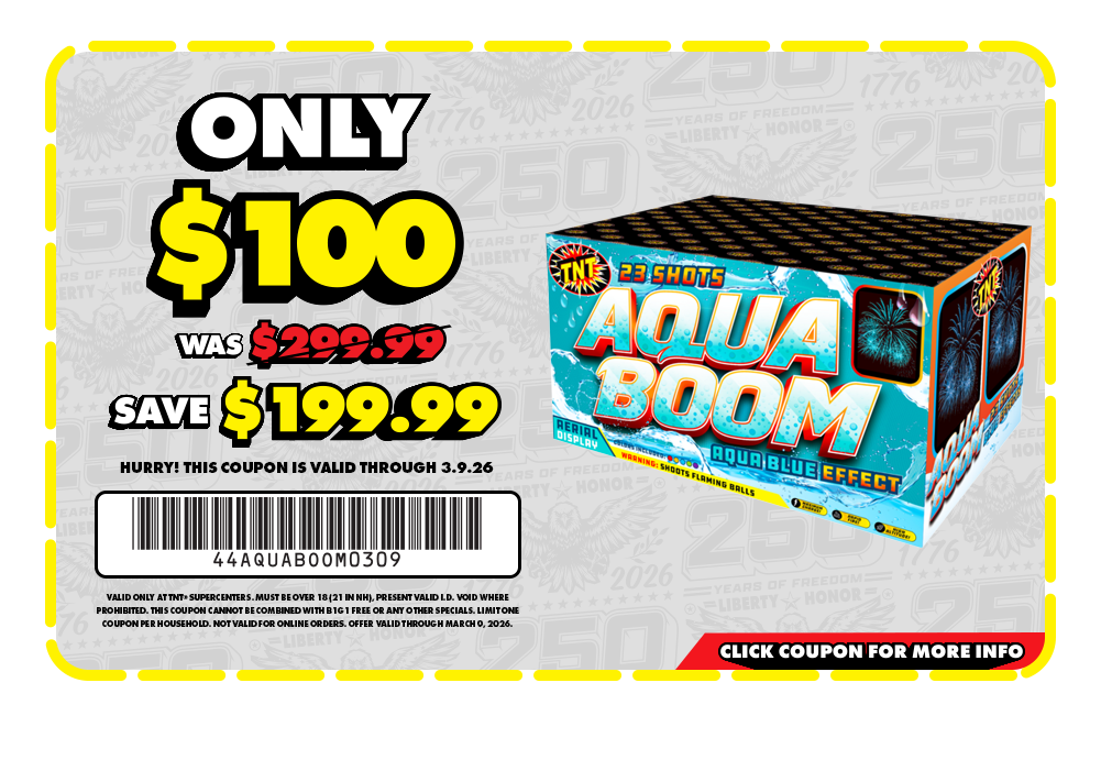 Supercenter Deal of the Week: Purchase 'Aqua Boom' for only $100 each - Save up to $199.99. Valid only at TNT Supercenters. Limit two per purchase, one coupon per household. Limited quantities available. Other restrictions apply, see coupon for details.