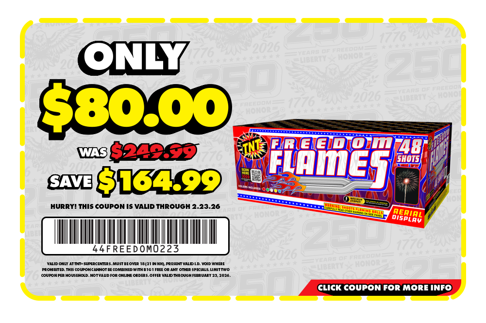 Supercenter Deal of the Week: Purchase 'Freedom Flames' for only $80 each - Save up to $164.99. Valid only at TNT Supercenters. Limit two per purchase, one coupon per household. Limited quantities available. Other restrictions apply, see coupon for details.