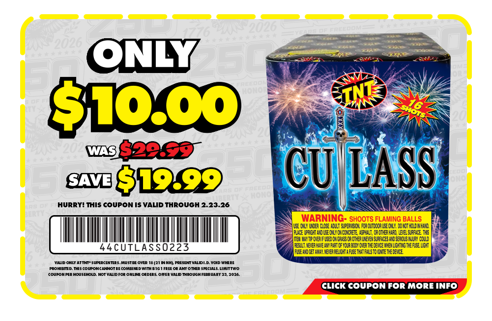 Sign up today to earn coupons, merch, and more when you shop at TNT® Fireworks locations!