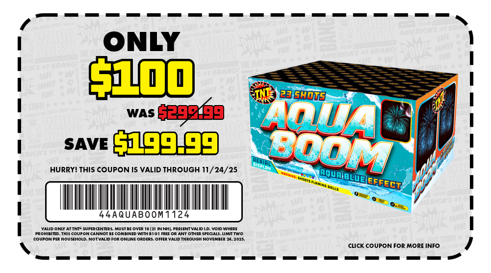 Supercenter Deal of the Week: Purchase 'Aqua Boom' for only $100 each - Save up to $199.99. Valid only at TNT Supercenters. Limit two per purchase, one coupon per household. Limited quantities available. Other restrictions apply, see coupon for details.