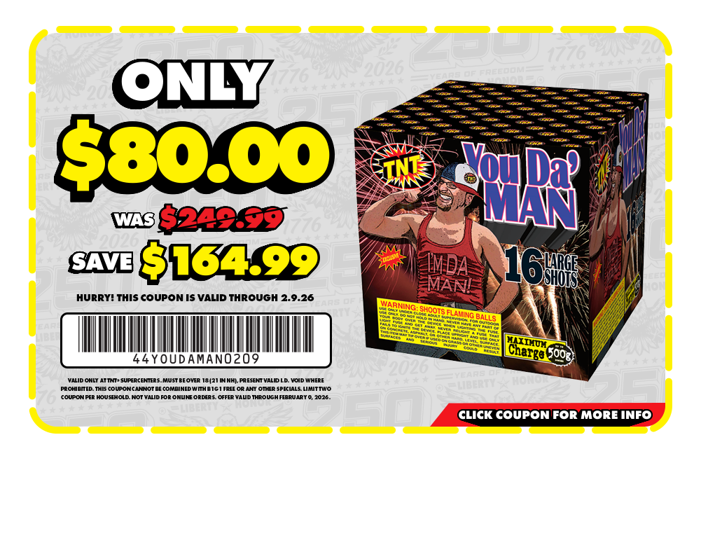Supercenter Deal of the Week: Purchase 'You Da Man' for only $80 each - Save up to $164.99. Valid only at TNT Supercenters. Limit two per purchase, one coupon per household. Limited quantities available. Other restrictions apply, see coupon for details.